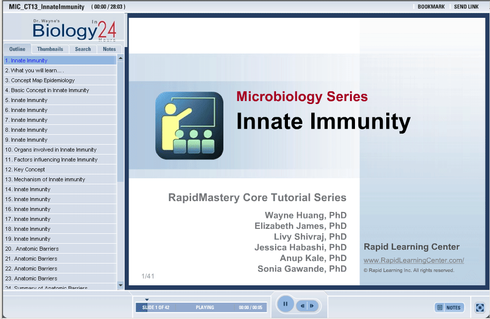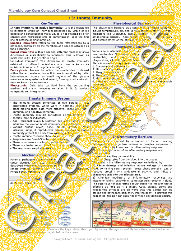 This module presents the concepts of Innate Immunity which is a nonspecific inherited immune system to prevent infection. This type of immunity acts on the species, race and individual levels. A given species may have an immunity to a pathogen however individuals or races within the species may have modified specific responses.