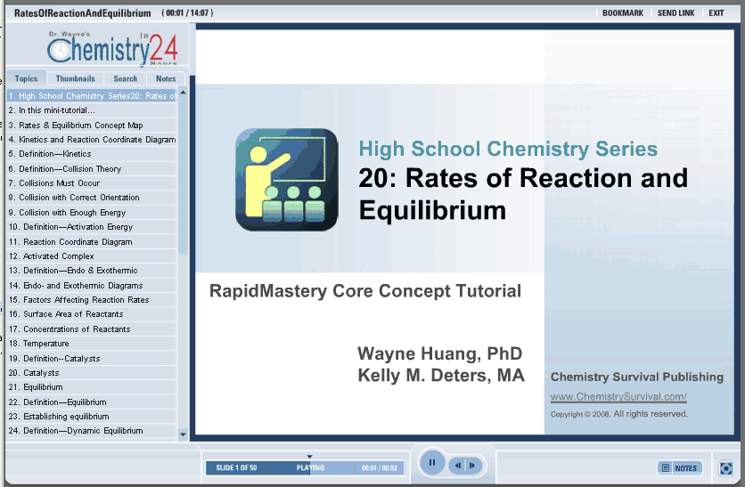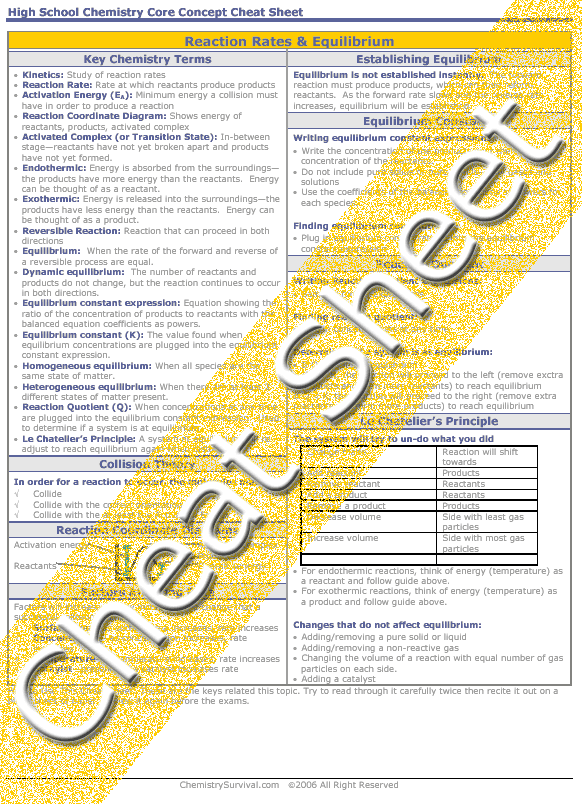 Kinetics is the study of reaction rates. This tutorial introduces factors affecting the rate of reaction. Equilibrium is established when the rate of the forward reaction is equal to the rate of reaction of the reverse reaction in a reversible reaction. This tutorial introduces how equilibrium is established, how equilibrium constant expressions are written and how equilibrium constants are calculated. Le Chatelier’s principle will be introduced.