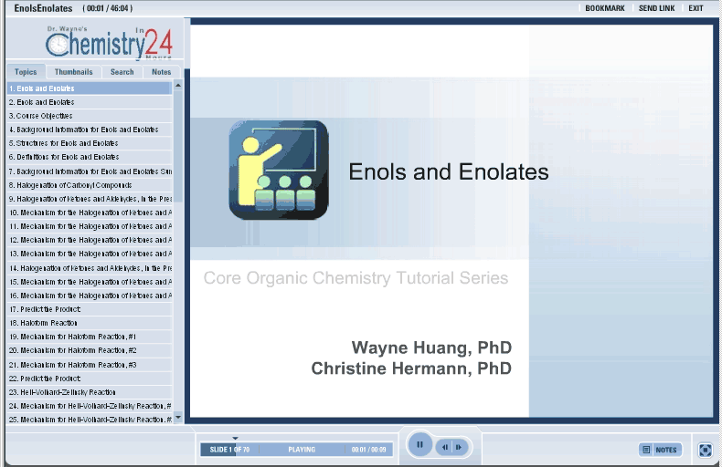 An enol contains a OH attached to a C=C. An enolate ion is a structure in which a O- is next to C=C or C=O is next to C-. Tautomerize is moving an electron pair to form another double bond, along with the movement of a H. Alpha substitution is replacement of H on alpha carbon, which is C next to C=O. Carbonyl condensation is a reaction in which the electrophile is another carbonyl compound.