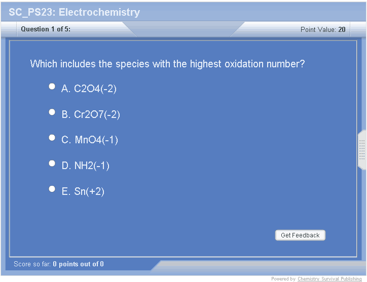 Electrochemistry is the study of the inter-change between chemical and electrical energy.  This tutorial begins explains oxidation states, redox reactions, and balancing redox reactions from earlier tutorials.  Voltaic cells, line notation standard cell potential and electromotive force (cell potential) are explained, along with electrolytic cells.