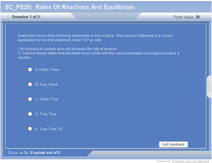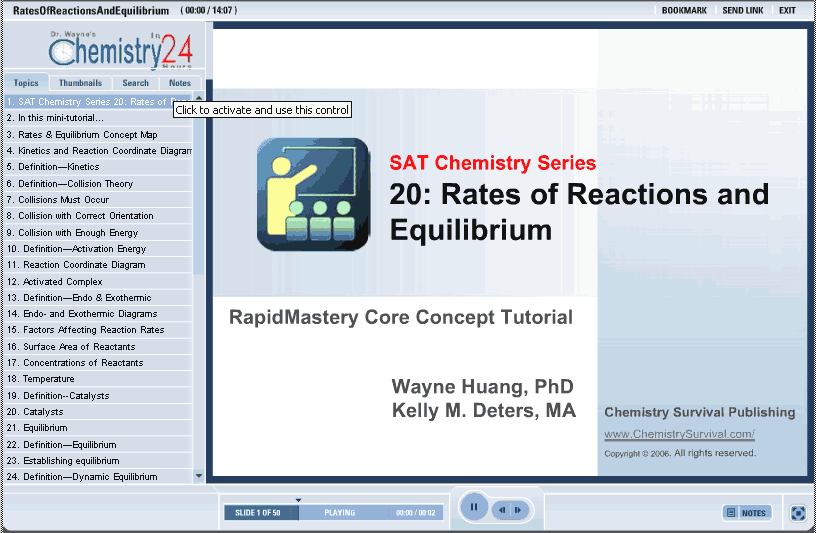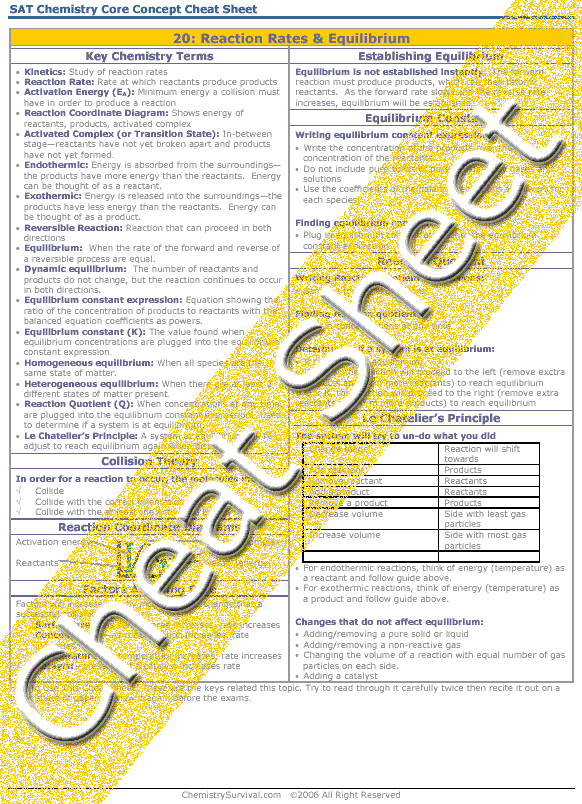 Kinetics is the study of reaction rates.  This tutorial introduces factors affecting the rate of reaction.  Equilibrium is established when the rate of the forward reaction is equal to the rate of reaction of the reverse reaction in a reversible reaction.  This tutorial introduces how equilibrium is established, how equilibrium constant expressions are written and how equilibrium constants are calculated.  Le Chatelier’s principle will be introduced.