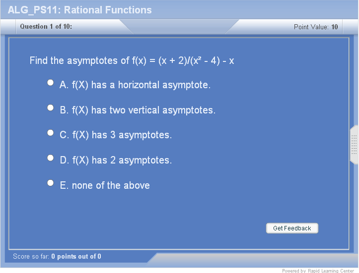 Basic definitions of rational functions Domain of rational functions Asymptotes of rational functions Formula Operations on rational functions Simple rational functions Simplification of rational functions Polynomial equations Solving polynomial equations