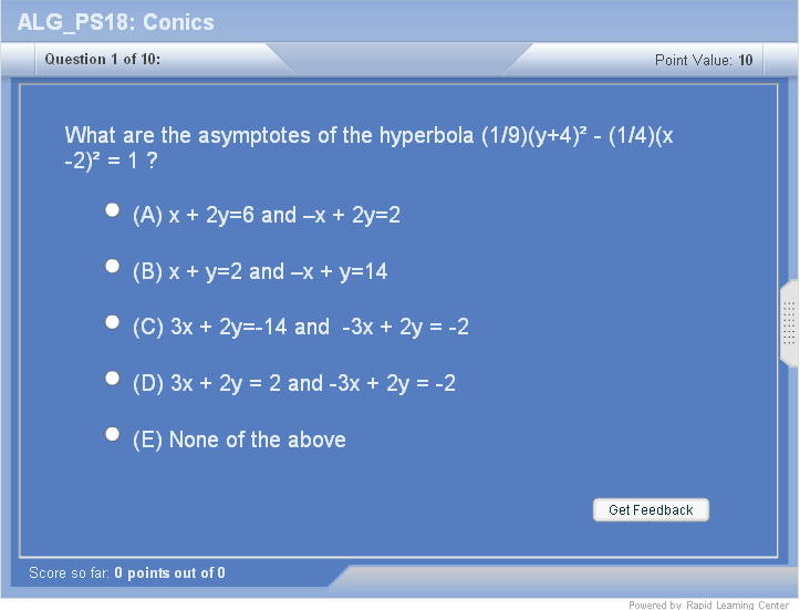 Introduction to Conic Sections A Brief History of the Conic Sections Some applications Parabola Definition of a parabola Different types of equations of a parabola Ellipse Definition of an ellipse Relationship between foci and axes Different types of equations of an ellipse Hyperbola Definition of a hyperbola Relationship between foci and vertices Mechanical vs. electromagnetic waves Different types of equations of a hyperbola Asymptotes of a hyperbola |