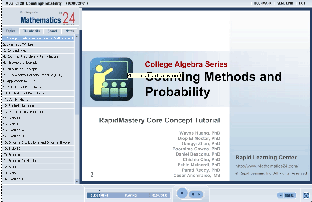 This tutorial shows the principal concepts of probability and counting. Permutations are shown in the examples with the use of tree diagrams and illustrations. The Fundamental Counting Principle is described with the use of an example. Combinations are shown with the use of factorials and tree diagrams.