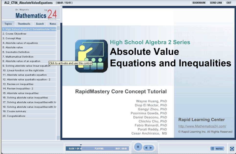 This tutorial shows the properties of absolute value equations and how are they used in problems. Absolute values are presented with the use of graphical examples. Linear equations and absolute values are used concurrently in problem solving examples.