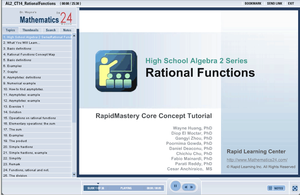 This tutorial describes rational functions and their properties. The domain of rational functions is described with the use of horizontal and vertical asymptotes. The degrees of the two functions composing of a rational function are important to find the asymptotes of rational functions.