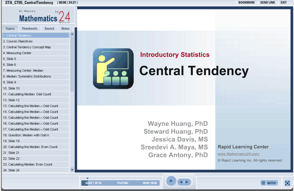 This tutorial describes central tendency and their use in application problems. You will learn how to find the center of a distribution, compute the mean and median of a set of data. You will also understand how outliers affect the median and mean.