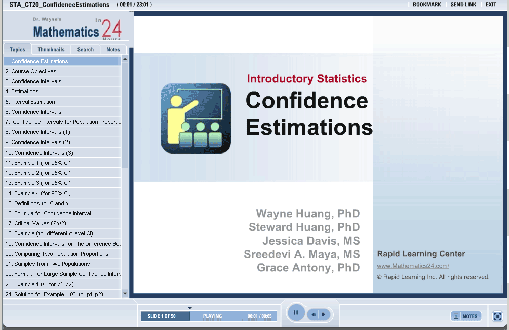 By completing this course, you will learn about the confidence estimation, including confidence intervals, confidence intervals for population proportions, confidence intervals for the difference between two population proportions, confidence interval for population means, confidence intervals for the difference between two population means and small sample size confidence interval for population means