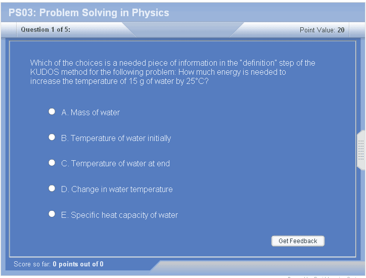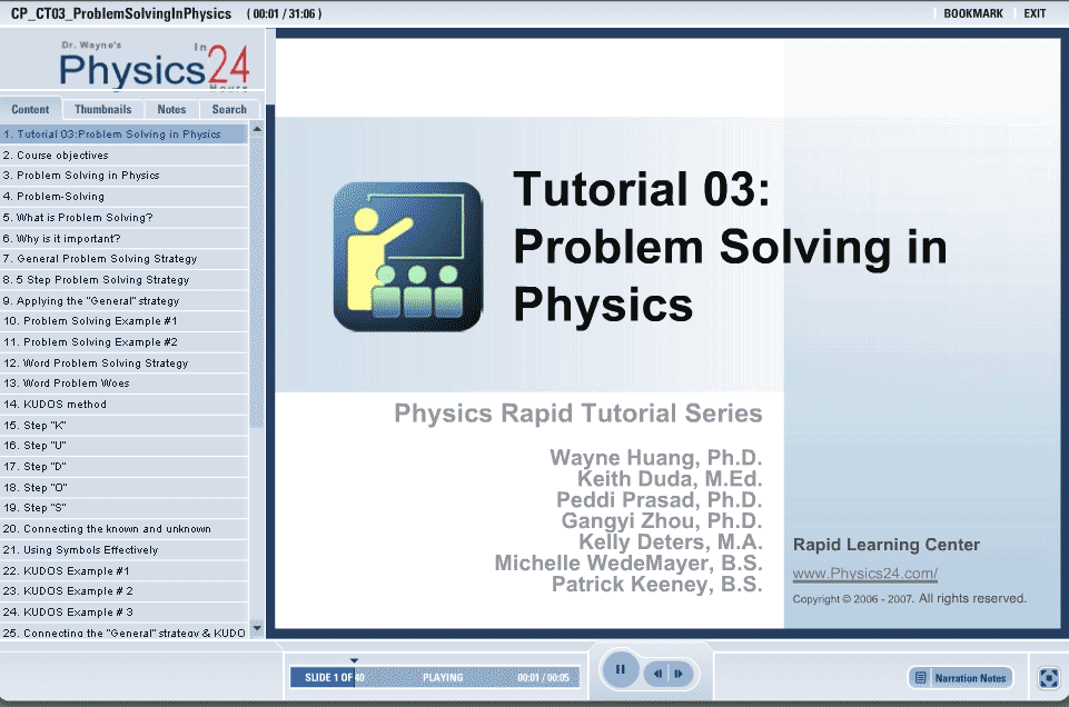 Problem solving doesn’t just apply to working out physics problems.  It applies to many academic and real life topics.  This tutorial gives a very general outline to help attack any type of problem.  A common difficulty with science classes is the dreaded word problem.  The KUDOS method gives the student a place to start and a step by step method to begin the solution.  KUDOS stands for known, unknown, definition, output, and substantiation.  In addition to problem solving, this tutorial give hints to succeed on tests.  Multiple choice, free response, and essay tips are all covered.