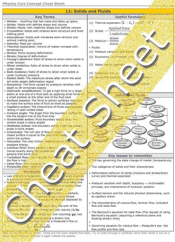 This tutorial covers two topics, solids and fluids.  The difference between the ordered atomic structure of crystalline solids, and the random nature of amorphous solids is discussed. Other properties of solids like thermal expansion and various deformations of solids are covered too.  Next the nature of fluids is described through key concepts like Pascal’s, Archimede’s, and Bernoulli’s principle.  Finally, fluid flow is described.  Smooth laminar flow and chaotic turbulent flow are contrasted.  This idea is extended with Bernoulli’s equation which describes the relationship between the pressure, kinetic and potential energy in a system as a constant.