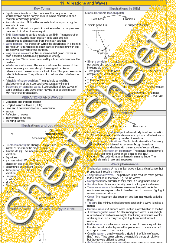 Periodic motion likes waves come in many types. Mechanical waves need a medium to travel, electromagnetic waves don’t. Transverse waves vibrate perpendicular to the wave motion, longitudinal waves parallel. Even a simple swinging pendulum exhibits wave behavior. All of these waves can be described in certain ways. They all have speed, frequency, period, amplitude and wavelength. Wave can also combine, or superimpose with each other. This phenomena leads to interference. This can be constructive or destructive interference. In some situations where there is a boundary to reflect from, this leads to a standing wave that seems to sit in one location. This creates points of no movement, nodes, and points of maximum movement, antinodes.