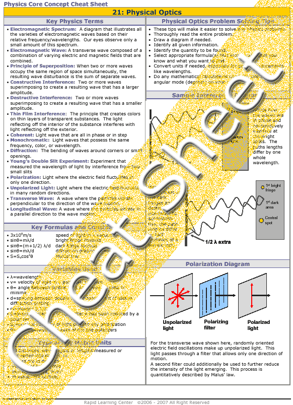 The electromagnetic spectrum describes the wide variety of light observed.  Light can behave as a particle, or a wave.  In this tutorial topic, the wave nature of light is emphasized.  Young’s double slit experiment shows how light can constructively and destructively interfere.  The alternating bright and dark fringes are explained mathematically.  Diffraction grating of multiple slits also exhibit similar behavior.  Another wave feature of light is polarization.  Because light is a transverse wave, it can be polarized to vibrate in only one direction.  This can be accomplished with polarizing filters.  Malus’ law describes the reduced light intensity caused by a pair of polarizing filters.
